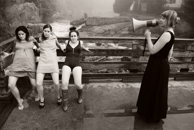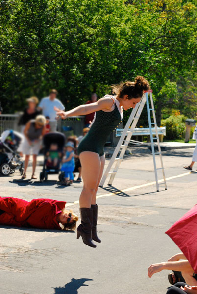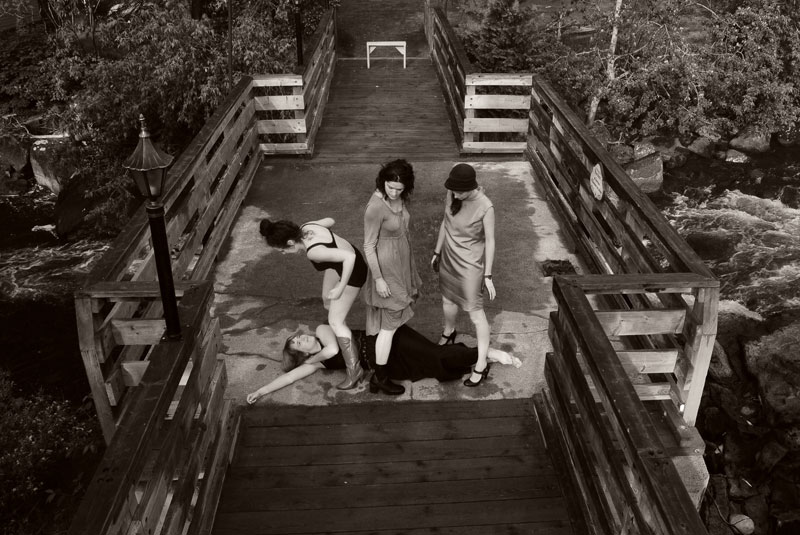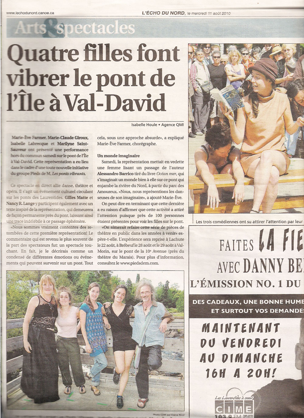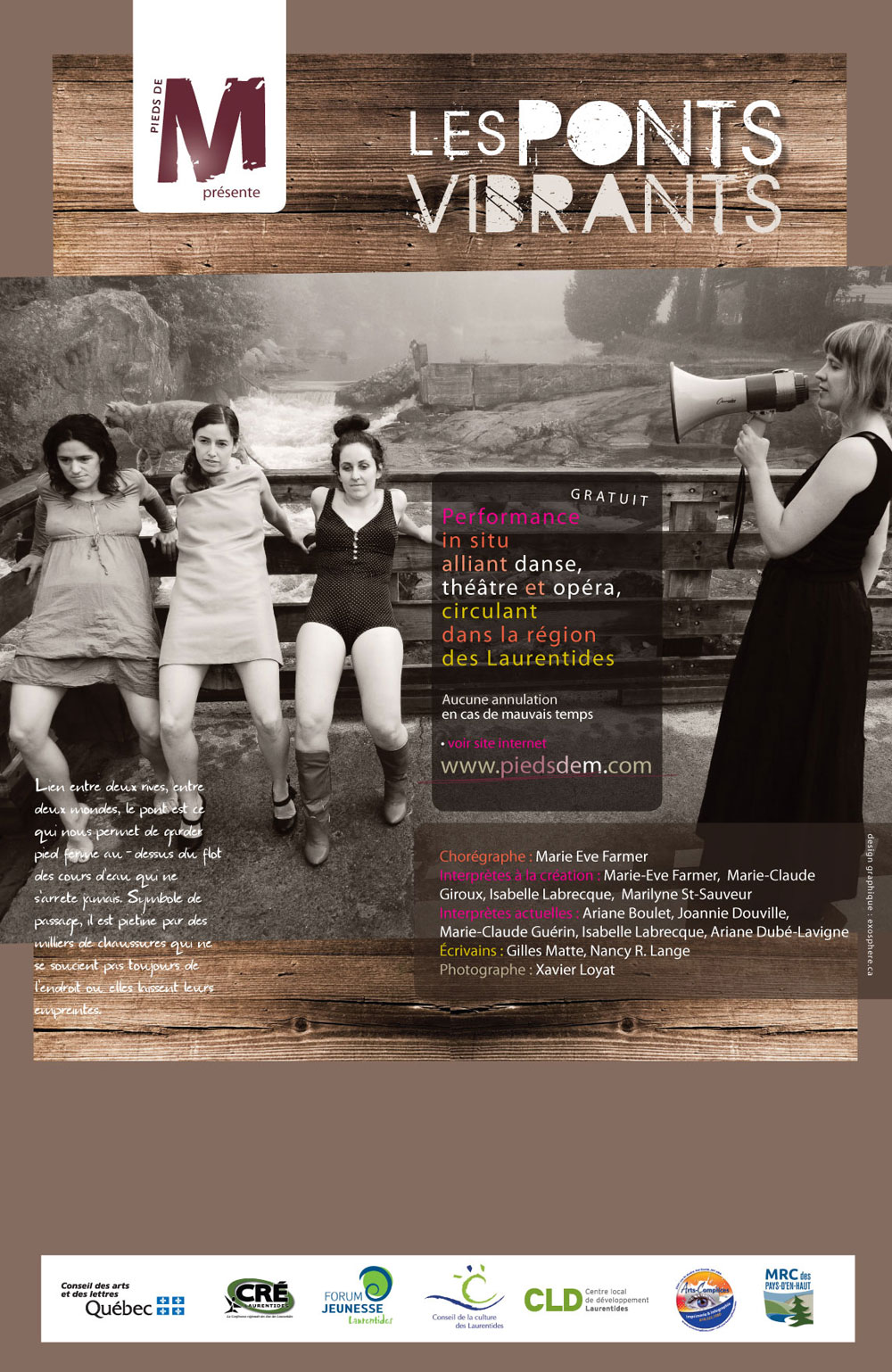 Lien entre deux rives, entre deuxmondes, le pont est ce qui nous permet de garder pied ferme au-dessus du flot continuel des cours d’eau. Les Ponts vibrants est une performance in situ alliant danse, théâtre et opéra. Il crée un événement public circulant sur divers lieux publics, idéalement un pont, mais également parcs et autres lieux de passage. Quatre femmes dans le vent, accompagnées de la plume d'un poète, donnent vie à ces divers lieux, d'une manière romantico-comique originale et sensible. La plume du poète, qui écrit en direct, laisse une trace permanente de la performance et crée ainsi une route poétique unique en son genre. (voir le calendrier pour dates et lieux précis).